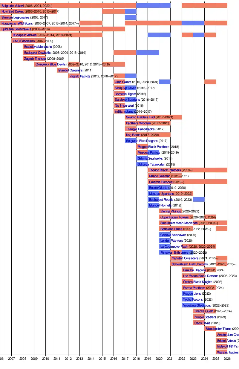 Die ersten vier Spielzeiten fanden von Frühling bis Herbst statt, mit einer Unterbrechung im Sommer. Seit 2010 werden die Spiele im Frühling und im Sommer ausgetragen. Aktueller Titelträger sind die Danube Dragons aus Wien.