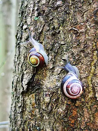 Eine Garten-Bänderschnecke (Cepaea hortensis, links) mit einer Hain-Bänderschnecke (Cepaea nemoralis, re.) | ||||||||||||