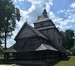 Die Kirche gehört zum galizischen Typus der Holzkirchen. Sie besteht aus gehauenen Baumstämmen, die horizontal verlegt sind. Das gesamte Bauwerk und die steilen Dächer sind mit Holzschindeln verkleidet oder bedeckt. Die Kuppel ist viereckig angelegt.