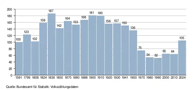 - ↑ Daten der Eidgenössischen Volkszählungen ab 1850 nach Gemeinden. (XLSX; 10 MB) Bundesamt für Statistik, Neuchâtel, 12. Juli 2024, abgerufen am 26. März 2025 (Öffnung in Excel nur über "Anhang/Excel-Datensatz" möglich).