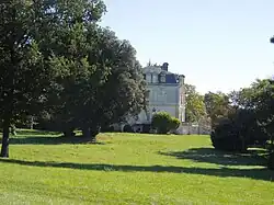 An der dem Park zugewandten Rückseite verläuft eine ganzseitige Terrasse über dem früher die Orangerie enthaltenden Kellergeschoss, zu der eine breite Freitreppe mit geschwungenem, die Balustradenumfassung der Terrasse weiterführendem Steingeländer hinaufführt. Mittig ragt ein etwa vier Meter hervortretender, beide Geschosse umfassender, fünf-achtel-Risalit auf, mit je drei Fenstern in jedem Stockwerk und im Dachgeschoss durch drei große Zwerchhausfenster gekrönt. Rechts und links befinden sich jeweils zwei große Sprossenfenster in beiden Etagen, im Dachgeschoss rechts und links jeweils ein repräsentativ gearbeitetes Zwerchhaus.