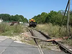Die nicht mehr in Betrieb befindliche Eisenbahnlinie von Gouaix nach Montereau-Fault-Yonne in Châtenay-sur-Seine. Im Hintergrund steht eine Rangierdiesellokomotive mit dazugehörendem offenem Güterwagen.