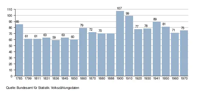 - ↑ Daten der Eidgenössischen Volkszählungen ab 1850 nach Gemeinden. (XLSX; 10 MB) Bundesamt für Statistik, Neuchâtel, 12. Juli 2024, abgerufen am 15. Mai 2025 (Öffnung in Excel nur über "Anhang/Excel-Datensatz" möglich).