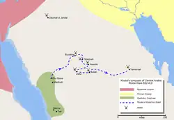 Nach dem Abschluss der Unterwerfung Zentralarabiens zog Chālid im Frühsommer 633 gemeinsam mit al-Muthannā ibn al-Hāritha von den Banū Bakr ibn Wā'il in Richtung des Euphratgebietes. Die Quellen sprechen von einer ganzen Reihe von Kämpfen mit lokalen Herrschern bei Nahr al-Mar'a, Waladscha, Ullais, Amghīschīya und Mudschtamaʿ al-anhār, die alle siegreich verliefen.[27] Höhepunkt des Eroberungszuges war die Einnahme der Städte al-Hīra, das damals den Lachmidenfürsten als Residenz diente, und al-Anbār, zu jener Zeit die zweitgrößte Stadt des Irak. Dann griff er die 90 Kilometer weiter südlich gelegene Grenzfestung ʿAin at-Tamr an, überwältigte deren Garnison und machte zahlreiche Gefangene, die nach Medina überführt wurden. In ʿAin at-Tamr erhielt Chālid den Auftrag, zu der Oase Dūmat al-Dschandal zu marschieren, wo der christliche Stammeschef Ukaidir ibn ʿAbd al-Malik seine Loyalität gegenüber Medina aufgekündigt und zusammen mit einer Koalition arabischer Stammesgruppen ein Zentrum des Widerstands gegen die muslimische Herrschaft aufgebaut hatte. Chālid konnte mit seinen Truppen diese Koalition besiegen; Ukaidir fiel in der Schlacht.[28]