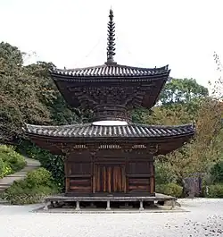 Die Haupthalle (Hondō) aus der Kamakura-Zeit hat einen fast quadratischen Grundriss von 5 × 5 Ken, hier 13 × 15,35 m. Sie besitzt ein Fußwalmdach. Daneben steht eine Schatzpagode (Tahōtō), sie stammt aus dem Ende der Kamakura-Zeit oder aus dem Beginn der Muromachi-Zeit. Sie hat eine Seitenlänge von 3 Ken und ist in reinem „japanischen Stil“ ausgeführt. – Alle drei Gebäude gehören Nationalschätzen Japans.