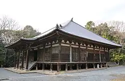 Die Haupthalle (Hondō) stammt aus der Muromachi-Zeit und ist als Nationalschatz registriert. Sie hat quadratischen Grundriss mit dem Maß 7 Ken × 7 Ken, hier 19,5 m × 19,5 m. Das Tempelgebäude ist ein klassisches Beispiel für ein Gebäude im „gemischten Stil“. Die Halle ist in einen äußeren (外陣, Gejin) und einen inneren Teil (内陣, Naijin) gegliedert. Im Najin befindet sich auf einer Basis (須弥壇, Shumidan) ein Schatzkasten (宮殿, Kyūden), auf dessen Rückseite die Jahresangabe „Ōei 20“ (1413) zu finden ist, die auf die Verlegung hierher deutet. 1418 wurde mit dem Dach begonnen, 1428 war das Gebäude fertiggestellt. – Am Vordach über dem Eingang ist eine kreisrunde flache Schelle befestigt, die nach unten geöffnet ist und als „Krokodil-Maul“ (鰐口, Wani-guchi) bezeichnet wird. Man kann sie mit einem Seil und Klöppel läuten. Sie stammt aus dem Jahr 1285 und ist damit die älteste in der Präfektur. Im Tempel befindet sich eine Trommel (Taiko), deren Inschrift auf das Jahr 1298 weist.
