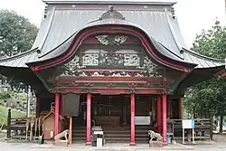 Unmittelbar westlich des Tempels steht ein Schrein, der Shirayama-jinja (白山神社; S). Der Seitenweg dahin führt unter einem Torii (T) hindurch.