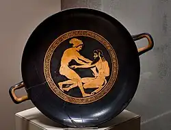 - Louvre, Paris, Inventarnummer MNB 2040; gefunden in Korinth; Motiv Innen: gelagerter Lyra spielender Jüngling beim Symposion[1]