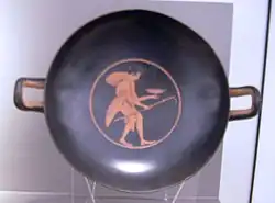 - Antikensammlung, Berlin, Inventarnummer 4040; gefunden in Korinth; Motiv Innen: nach rechts laufender Jüngling, in einer Hand ein Wanderstab in der anderen Hand eine Trinkschale[4]