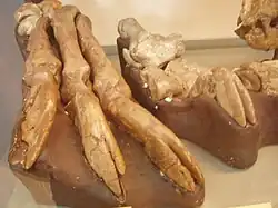 Sehr markant war der Aufbau der Gliedmaßen der Chalicotherien, vor allem der Hände und Füße. Dabei unterscheiden sich die ursprünglicheren Chalicotherien durch eine gleich lange Gestaltung der Hinter- und Vorderbeine deutlich von den späteren. Die Hinterfüße endeten in drei (Metatarsus II–IV), die Vorderfüße in vier Zehen (Metacarpus II–V), von denen der fünfte Strahl aber nach und nach reduziert wurde. Die stammesgeschichtlich ältesten Formen, wie Litolophus, besaßen noch Hufe an den Endgliedern der Hände und Füße,[8] weiter entwickeltere Formen wie Grangeria möglicherweise schon kurze Krallen.[9] Die Schizotheriinae trugen dann jeweils lang ausgebildete Krallen, die Endglieder der Zehen an Vorder- und Hinterfuß besaßen darüber hinaus einen Mechanismus zum Einziehen der Krallen, ähnlich wie bei heutigen Katzen, so dass sie wie andere Huftiere auf ihren Zehen laufen konnten (Zehengänger). Im Gegensatz zu anderen Unpaarhufern verlief bei einigen dieser Vertreter die Hauptachse der Hände und Füße aber nicht durch den Mittelstrahl (Metapodium III), bei Moropus waren die Strahlen III und IV eher gleich groß.[7]