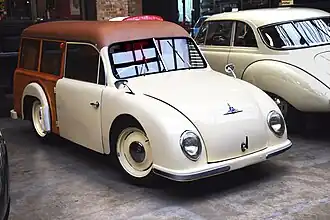 Die zweitürige Karosserie in Form eines Kombis war mit einem Zentralrohrrahmen verschraubt; sie bot Platz für vier Personen. Der Aufbau des Hecks war aus Holz. Einerseits war das damals modern, andererseits konnten dadurch teure Presswerkzeuge eingespart werden. Vorn hatte der Wagen Einzelradaufhängung an doppelten Querlenkern, hinten an einer Pendelachse sowie Gummitorsionsfedern und mechanisch betätigte Trommelbremsen an allen vier Rädern. Unter der vorderen Haube waren Tank und Reserverad untergebracht, sodass der verbleibende Kofferraum klein war.