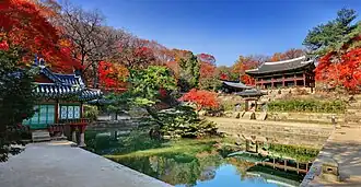 Der Changdeokgung-Palast gilt als ein repräsentatives Bauwerk der koreanischen Architektur aufgrund seiner einzigartigen räumlichen Komposition, in der er sich in die Natur harmonisch einfügt.[1]