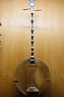 Einen kleineren Korpus, aber einen der kambodschanischen Laute entsprechenden, sehr langen, dünnen Hals hat die chinesische dreisaitige sanxian, deren Namen bereits in der Tang-Dynastie (618–907) bekannt war und die auf chinesischen Felsmalereien des 12. Jahrhunderts dargestellt ist.[20] In Japan wird sie shamisen genannt. Einen, im Unterschied zu den beiden, nicht runden, sondern trapezoid-kantigen flachen Korpus mit einem ebenso schlanken Hals besitzt die seltene vietnamesische đàn đáy,[21] die eine Kombination aus der zweisaitigen vietnamesischen Mondlaute đàn nguyệt und der langen dreisaitigen Spießlaute đàn tam mit einem gerundeten kleinen Korpus darstellt.[22] Die đàn nguyệt mit zwei Saiten aus Seide oder Nylon, vom belgischen Musikwissenschaftler und Komponisten Gaston Knosp (1907) als „viersaitige Guitarre mit kreisförmigem Schallkasten“ umschrieben, weil sie um 1900 offenbar mit Doppelsaiten aus Seide ausgestattet war,[23] hat einen längeren Hals als andere Mondlauten, also ein der chapey dang veng ähnlicheres Größenverhältnis zwischen Korpus und Hals.