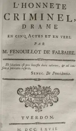 - L’Honnête Criminel, ou l'Amour Filial. Drama in fünf Akten, erschienen 1767 und in Paris aufgeführt bei M. de Villeroy, Comédiens français am 2. Februar 1768; Paris, Théâtre de la Cour, Comédiens ordinaires du Roi, 10. Juli 1769. online