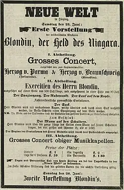 Am 11. Juni 1864 traf Charles Blondin in Wien ein.[15] Er logierte im Hotel Schwender.[16] Wien war die erste Stadt im deutschsprachigen Raum, die er besuchte.[17] Seinen ersten Auftritt hatte er am 25. Juni im Etablissement Neue Welt in Hietzing.[18] Die Presse schrieb:
