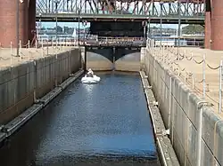 ![]() Der Charles River Dam mit Pumpenhaus (links) und Schleusen (Mitte). | |