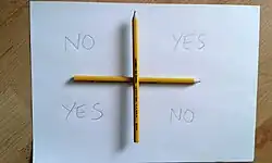 Bei dieser Art von Spiel werden zwei Stifte verwendet, um ein Raster (mit Feldern mit den Titeln „Ja“ und „Nein“) zu bilden und dann der „übernatürlichen Macht“ „Charlie“ Fragen zu stellen. Der obere Bleistift wird dann beobachtet, um zu sehen, welche Antwort Charlie gibt. Die erste Frage, die jeder stellt, ist „Können wir spielen?“ oder „Bist du hier?“ Der obere Bleistift befindet sich auf einem zentralen Drehpunkt in einem instabilen Gleichgewicht, was bedeutet, dass er sich durch leichten Lufthauch einfach drehen kann, oder das Atmen der Spieler, die den Bleistift beobachten, den Bleistift in Rotation versetzen kann.[4]