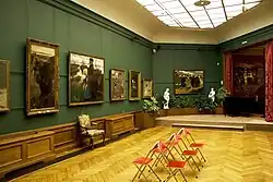 Auch Bildhauer sind vertreten, mit Werken von Guillaume Charlier, Emile Namur und Rik Wouters. Die Salons sind reich an Möbeln und dekorativen Kunstgegenständen aus der Zeit Ludwigs XV., Ludwigs XVI. und des Empire, an Wandteppichen aus Brüssel, Audenarde und Aubusson, an Teppichen, Porzellan und Goldschmiedearbeiten.[2]