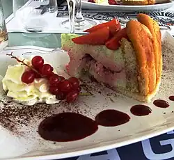 heißt eine Erdbeer-Charlotte, die aus Scheiben von Rouladenbiskuit mit Erdbeerkonfitüre hergestellt wird. Eine Kuppelform wird mit den Biskuitrollenstücken ausgekleidet und mit bayerischer Creme gefüllt, dann mit Biskuitboden abgedeckt. Die erkaltete, schnittfeste Charlotte wird auf eine gekühlte Unterlage gestürzt und abschließend mit Erdbeeren, Brandmasse-Ornamenten und Minze garniert.