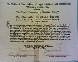 - ↑ Charlotte Hawkins Brown - Educator - Biography. 27. März 2019, archiviert vom am 27. März 2019; abgerufen am 8. Oktober 2021. Info: Der Archivlink wurde automatisch eingesetzt und noch nicht geprüft. Bitte prüfe Original- und Archivlink gemäß Anleitung und entferne dann diesen Hinweis.