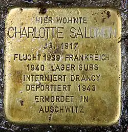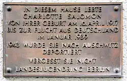 Am 21. April 2012 wurde vor dem ehemaligen Wohnhaus, in Berlin-Charlottenburg, Wielandstraße 15, ein Stolperstein für Charlotte Salomon verlegt. Außerdem erinnert eine Gedenktafel am Haus an sie. Im Jahr 2006 wurde eine Straße in Berlin-Rummelsburg nach ihr benannt, und seit 1990 trägt eine Berliner Grundschule ihren Namen.[6][7]