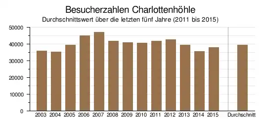 In den Jahren 2011 bis 2015 lag die durchschnittliche Besucherzahl bei 39.483.[31] Mit diesem Wert lag die Schauhöhle im oberen Mittelbereich der Schauhöhlen in Deutschland. Von den zwölf Schauhöhlen der Schwäbischen Alb[32] wurde die Charlottenhöhle im Vergleichszeitraum nur von der Bärenhöhle (jährlich 78.200 Besucher) und der Nebelhöhle (jährlich 45.800 Besucher) übertroffen. Von den 25 Schauhöhlen Süddeutschlands (Baden-Württemberg und Bayern)[32] wird die Charlottenhöhle von fünf Höhlen überboten, wobei die Teufelshöhle bei Pottenstein mit 142.500 Besuchern im Durchschnitt der Jahre 2011 bis 2015 die meisten Besucher hat.