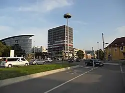 Der Verkehrsknoten Charlottenplatz, rechts im Bild das Alte Waisenhaus.