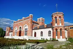 Das Gebäude ist aus roten Klinkersteinen im Maurischen Stil mit burgartigen Zinnen und Türmen errichtet.