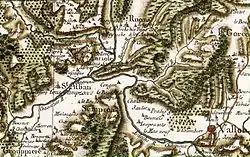 Eine alte Karte (Carte de Cassini) des Ardèche-Tals (Vallon-Pont-d’Arc unten rechts)