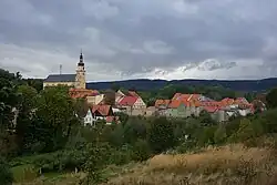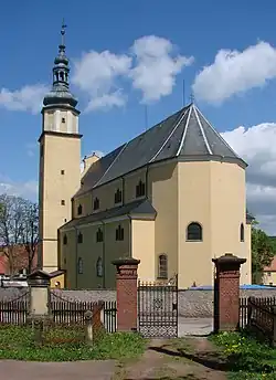 - Die römisch-katholische Pfarrkirche Heilige Familie (vormals St. Joseph, nach 1945 polnisch Kościół parafialny pw. Świętej Rodziny) wurde als barocke Saalkirche an der Stelle eines früheren Baus 1670–1680 nach Plänen von Martino Allio von dem Maurermeister Hans Brewer sowie ab 1684 durch den Maurermeister Martin Urban errichtet. Das Gebäude wurde als Stiftung des Grüssauer Abts Bernardus Rosa errichtet. Der Turm wurde 1690–1691 erbaut. Die Kirche besitzt eine reiche barocke Innenausstattung, die von Künstlern der Grüssauer Werkstätten geschaffen wurden. Das spätgotische Flachrelief mit der Krönung Mariens aus der Zeit um 1500 schuf der „Meister der Lübener Figuren“. Der Hauptaltar, der Tabernakel und mehrere Skulpturen stammen von Joseph Anton Lachel. Die Kanzel schuf 1686 Georg Schrötter, das Gemälde des hl. Innozenz 1734 Georg Wilhelm Neunhertz und die Gemälde der Kreuzwegstationen 1751 Felix Anton Scheffler. Außerdem gibt es mehrere steinerne Epitaphien aus dem 18. Jahrhundert.