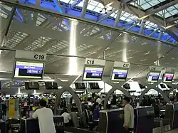 Über den Schaltern sind meistens Bildschirme oder einfache Schilder angebracht, auf denen die Fluggesellschaft oder die Flugnummer des abzufertigenden Fluges angezeigt wird.