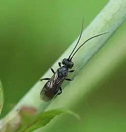 Chelonus cf. scabrator, Weibchen bei der Eiablage in einen Stängel | ||||||||||||