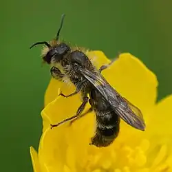 Chelostoma florisomne, Frontalansicht. Gut erkennbar die für Weibchen charakteristischen großen Mandibeln.