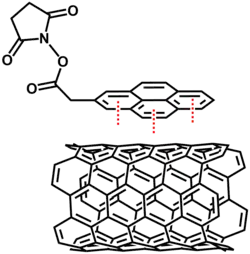 Bifunktionelle Moleküle werden verwendet, um CNTs zu modifizieren. Ein Molekülende ist eine polyaromatische Komponente, die mit der Nanoröhre π-π-Wechselwirkungen eingeht. Das andere Ende desselben Moleküls hat eine funktionelle Gruppe wie Amino-, Carboxy- oder Thiol-Gruppen.[1] Zum Beispiel Pyren-Derivate und Arylthiole wurden als Trägermaterial für verschiedene Metall-Nanoperlen wie Gold, Silber und Platin verwendet.[43]
