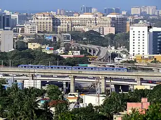 Durch Bevölkerungswachstum und steigende Motorisierung der Bevölkerung nimmt das Verkehrsaufkommen in Chennai konstant zu. 2011 gab es in Chennai 2,6 Millionen Motorräder und 560.000 Automobile, zehn Jahre zuvor waren beide Werte noch nicht einmal halb so groß.[42] Resultat sind zunehmende Verkehrsprobleme und Umweltverschmutzung. Chennai verfügt über ein relativ großes und weitverzweigtes öffentliches Nahverkehrswesen, das zwar sehr leistungsfähig, aber trotzdem zeitweise überlastet ist. Der Busverkehr wird von der staatlichen Metropolitan Transport Corporation (MTC) betrieben. Sie verfügte 2020 über eine Flotte von über 3800 Bussen und transportiert jeden Tag durchschnittlich 3,1 Millionen Fahrgäste.[43] Autorikschas stellen eine wichtige Ergänzung zum öffentlichen Nahverkehr dar.