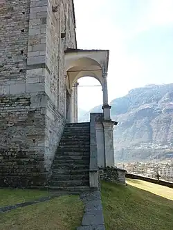 Die Kirche ist durch eine lange Treppe vom alten Dorfkern aus erreichbar. Zwei Freitreppen führen zum Hauptportal; sie wurden 1685 anstelle von schmaleren älteren gebaut. Das Säulenportal mit Säulen und Kapitellen in toskanischem Stil, das den Eingang schützt, stammt aus dem Jahr 1732. Die Frontfassade wird durch sechs Blendarkaden gegliedert, darüber liegt ein Doppelbogenfenster. Das grosse Bild neben dem Eingang ist in schlechtem Zustand; es zeigt eine Darstellung des Christophorus.