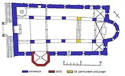 Die jetzige Gestalt der bergseitigen östlichen Partie geht auf das 12. Jahrhundert zurück: Je das letzte Joch auf jeder Seite wurde mit einem Kreuzgewölbe überdeckt, zusammen bilden sie dadurch eine Art eingezogenes Querschiff mit drei Kapellen. Im Chor springt die halbrunde Apsis nach aussen vor. Flache bemalte Kassettendecken aus Holz ersetzen die barocken Tonnen- und Kreuzgratgewölbe.