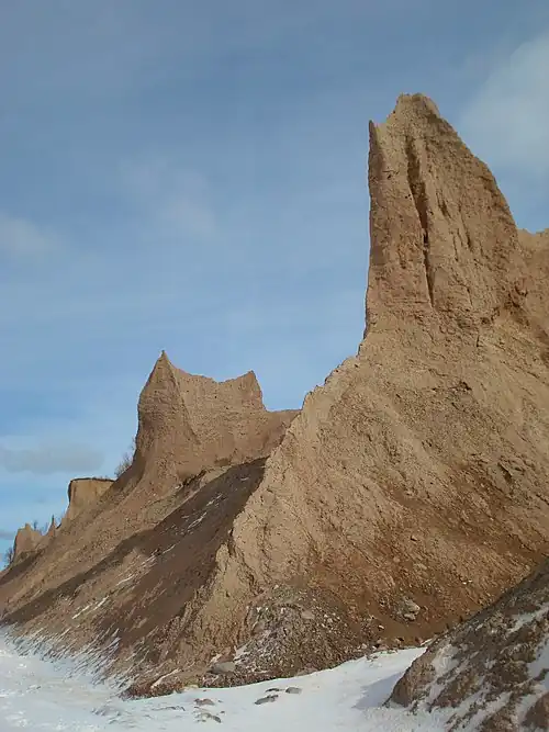 Die Bluffs entstanden durch Erosion aus Drumlins. Erosion durch Wind, Regen, Schnee und Dünung haben tiefe Furchen im weichen Boden hinterlassen, die zu pittoresken Klippen und scharfen Nadeln herausmodelliert wurden.[4] Auch wenn die Nadeln und Klippen, von denen einige über 46 m über das Seeufer aufsteigen,[5] schon seit tausenden Jahren bestehen, sind sie in ständiger Veränderung und fortschreitender Erosion begriffen.[4] Durchschnittlich beträgt die Erosions-Rate 0,3 bis 1,5 m pro Jahr.