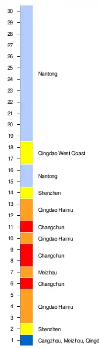 | Changchun | 12 | 9 | 11 | 13 | 14 | 16 | 15 | 16 | 16 | 14 | 16 | 11 | 11 | 10 | 13 | 13 | 10 | 10 | 11 | 12 | 12 | 12 | 11 | 13 | 10 | 12 | 12 | 10 | 9 | 9 |