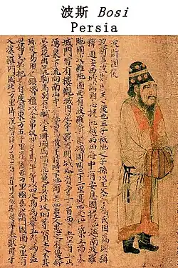 Der Diplomat und Entdecker Zhang Qian aus der Han-Dynastie, der 126 v. Chr. das benachbarte Baktrien und Sogdien besuchte, verfasste den ersten bekannten chinesischen Bericht über Parthien. Mit dem Sieg der Han im Krieg der Himmlischen Pferde gegen Dayuan wurde der Weg nach Westen frei und der kulturelle und wirtschaftliche Austausch zwischen beiden Zivilisationen über die Seidenstraße intensiviert sich.[4] Die Parther entsendeten einen Botschafter nach China und spielten auch eine Rolle bei der Einführung des Buddhismus über die Seidenstraße von Zentralasien nach China. An Shih Kao, ein parthischer Adliger und buddhistischer Missionar, ging 148 n. Chr. in die chinesische Hauptstadt Luoyang, wo er Tempel errichtete und als erster buddhistische Schriften ins Chinesische übersetzte. Das persisch geprägte Königreich Kuschana wurde zum Knotenpunkt für chinesisch-persisch-indische buddhistische Kontakte und die Übersetzung von buddhistischer Literatur. In China ließen sich auch persische Händler nieder, so zum Beispiel in der Stadt Canton in Südchina oder dem chinesisch dominierten Vietnam.[5] Auch unter den Sassaniden wurden die engen persisch-chinesischen Kontakte weitergeführt. In Südchina wurden zahlreiche sassanidische Münzen gefunden, welche enge Handelsbeziehungen belegen. Beide Reiche kooperierten bei der Sicherung des Handels über die Seidenstraße und kämpften gemeinsam gegen die Hephthaliten. Die letzten Mitglieder der königlichen Familie des Sassanidenreichs flohen nach Tang-China. Nach der Eroberung Persiens durch die muslimischen Araber entkam Peroz III., der Sohn von Yazdegerd III., zusammen mit einigen persischen Adligen und fand Zuflucht am chinesischen Kaiserhof. Sowohl Peroz als auch sein Sohn Narseh erhielten am Hof der Tang hohe Titel. Mindestens zweimal, das letzte Mal möglicherweise im Jahr 670, wurden chinesische Truppen mit Peroz entsandt, um ihm gegen die Araber zu helfen und ihn wieder auf den sassanidischen Thron zu setzen. Einer der Feldzüge endete möglicherweise in einer kurzen Herrschaft von Peroz in Sakastan (dem heutigen Sistan), von der nur wenige Zeugnisse erhalten sind. Narseh wurde später Kommandeur der chinesischen kaiserlichen Garde, und seine Nachkommen lebten in China als angesehene Adelige.[6] Während des 6. und 7. Jahrhunderts gelangten über Kontakte zu Persien das Nestorianische Christentum, der Manichäismus, der Zoroastrismus und die Sportart Polo nach China. Die persische Dichtung beeinflusste zudem die chinesische Dichtung.[5]