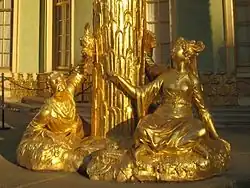 Die vergoldeten Sandsteinplastiken, am Fuß der Säulen sitzend und an den Wänden der Kabinette stehend, stammen aus den Werkstätten der Bildhauer Johann Gottlieb Heymüller und Johann Peter Benkert. Den Entwürfen für das Figurenensemble der essenden, trinkenden und musizierenden Chinesen standen den Bildhauern Menschen aus der Region Modell, woraus sich die europäischen Gesichtszüge der Figuren erklären.
