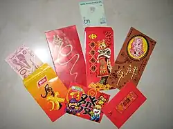 - 恭喜發財 / 恭喜发财, gōngxǐ fācái, Hokkien keong hee huat chye, Jyutping gung1hei2 faat3coi4, kantonesisch kung hei fat choi – „Glückwunsch für Erfolg und Wohlstand“