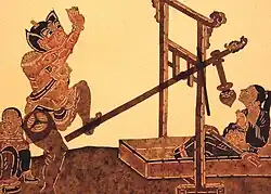 - Ein dritter Erklärungsansatz sieht den Ursprung des Schattentheaters in der sogenannten Laterne der galoppierenden Pferde. Es handelte sich hierbei um eine mit transparentem Papier umkleidete Trommel, in der von einer Kerze erzeugte heiße Luft ein Rad bewegt; die hieran befestigten Figuren werden von der Kerze als Schemen auf die Papierwand projiziert.