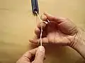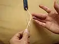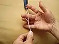 Der Chirurg hält den Faden zwischen Daumen und Mittelfinger während der Zeigefinger leicht abgespreizt ist. Mit einer rollenden Drehung der Knüpfhand legt er den Knüpffaden über den Zugfaden. Der Zeigefinger zieht den Zugfaden um den Knüpffaden. Während Daumen und Ringfinger den Faden fixieren, greift der Mittelfinger um. Dann ziehen Zeige- und Mittelfinger den Faden durch das Auge.[6]