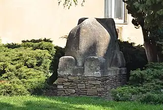 Natursteinplastik eines liegenden Elefanten in der Grünanlage des Vier-Jahreszeiten-Hof.[9]