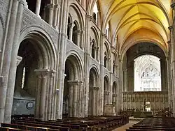 Der Grundriss der ca. 91 m langen, dreischiffigen und mit einem Querhaus versehenen Kirche entspricht einem lateinischen Kreuz, der Aufriss des normannischen Langhauses ist dreigeschossig basilikal mit Emporen; der flach schließende spätgotische Chor hingegen hat nur zwei Geschosse. Der ebenfalls spätgotische Glockenturm hat eine Höhe von ca. 37 m.