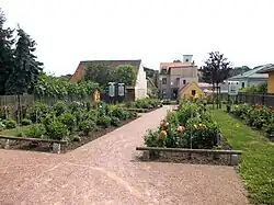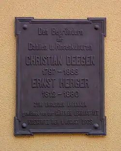 Eine nachgegossenen Gedenktafel für die Begründer der Dahlien- und Rosenkulturen in Bad Köstritz, Christian Deegen und Ernst Herger befindet sich heute am Eingang zum Dahlien-Zentrum Bad Köstritz.[4]