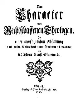 - Der Character eines Rechtschaffenen Theologen: in einer ausführlichen Abbildung nach dessen Beschaffenheiten überhaupt. Leipzig 1747. (Online und Download)