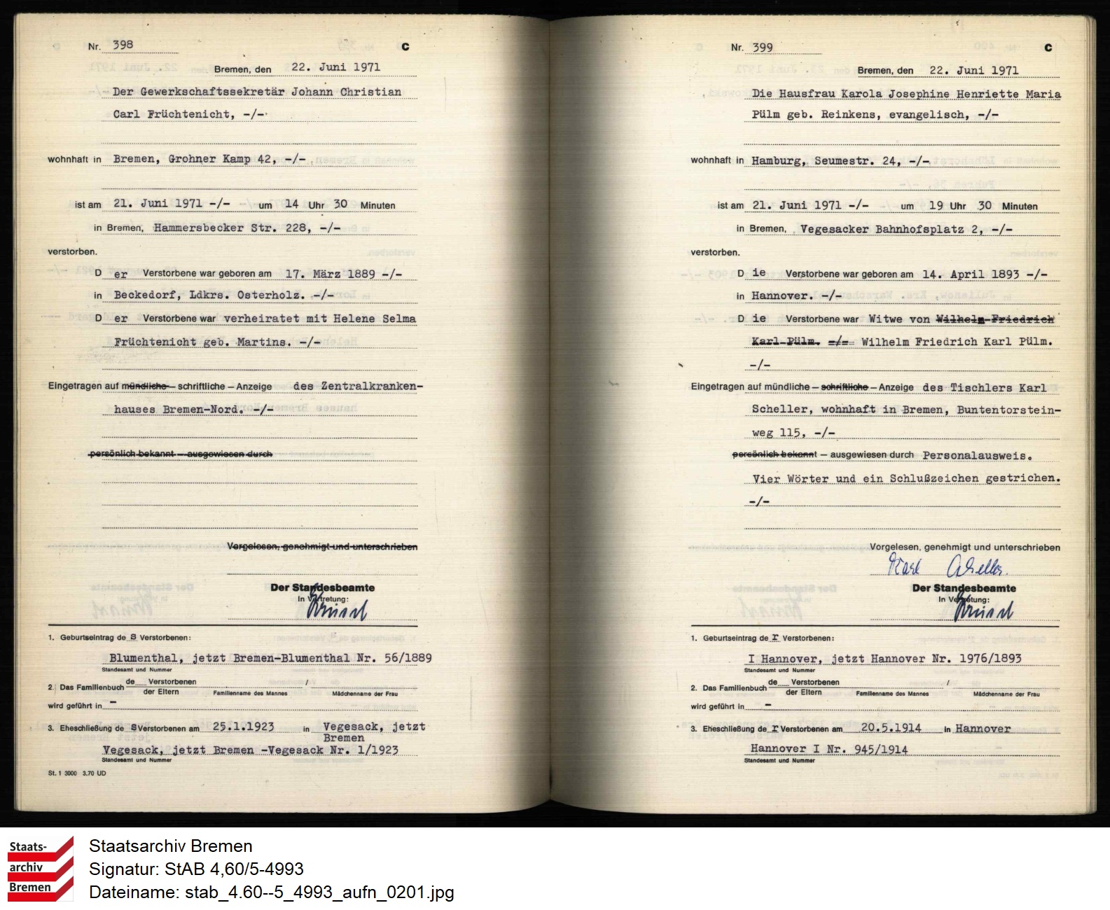 - ↑ Standesamt Bremen-Vegesack, Sterberegister 1971. Signatur: StAB 4.60/5 4993. In: arcinsys.niedersachsen.de. Staatsarchiv Bremen, abgerufen am 24. September 2024 (398 / 1971).