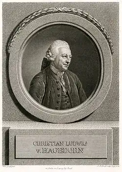 - Joseph Eduard Wessely: Hagedorn, Christian Ludwig von. In: Allgemeine Deutsche Biographie (ADB). Band 10, Duncker & Humblot, Leipzig 1879, S. 325.